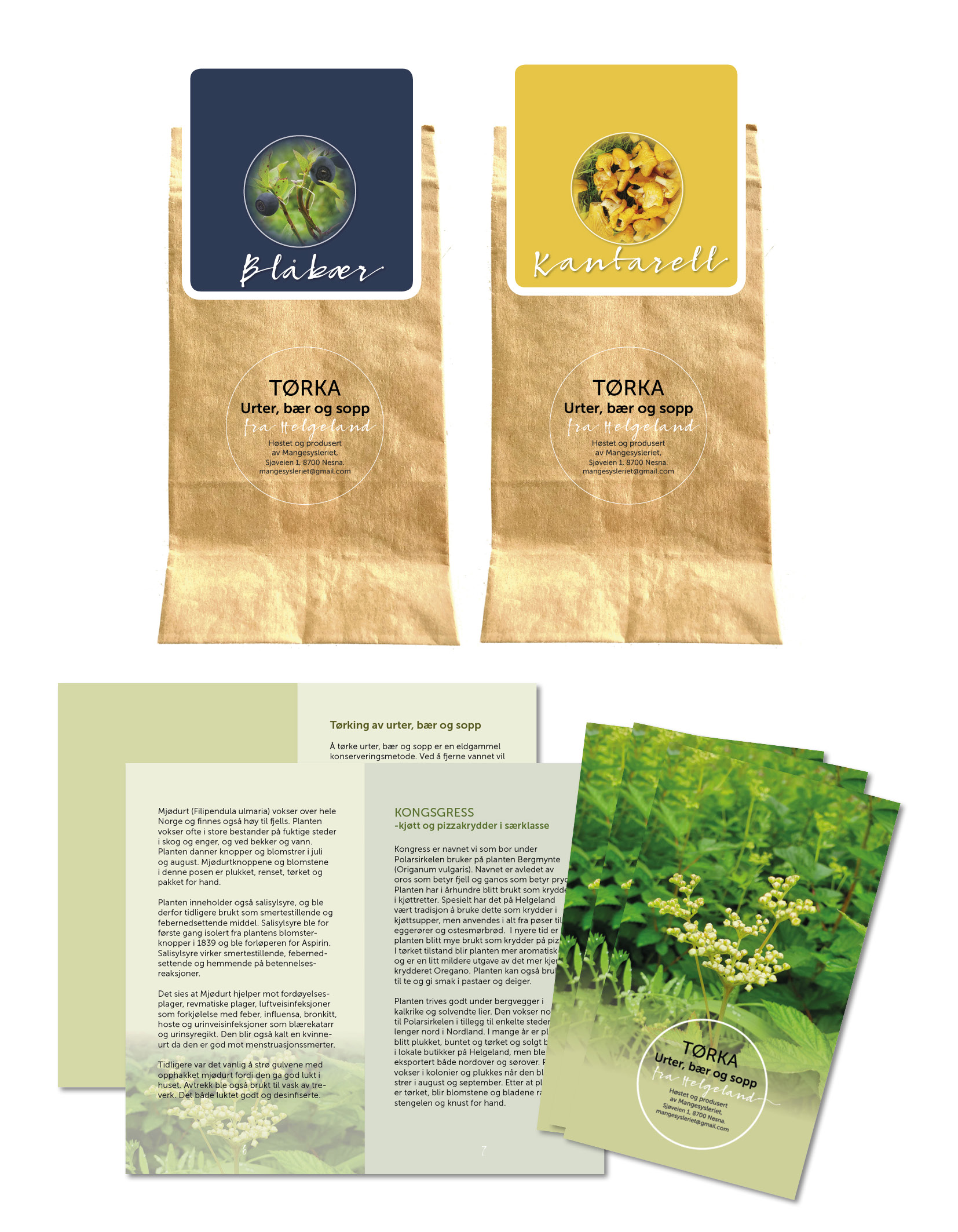 Design av brosjyre, etiketter Tørka urter, bær og sopp fra Helgelandl. Se bilder av den nye profilen her.